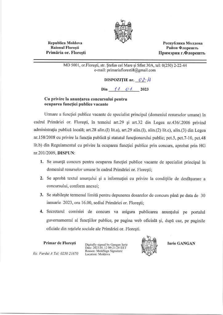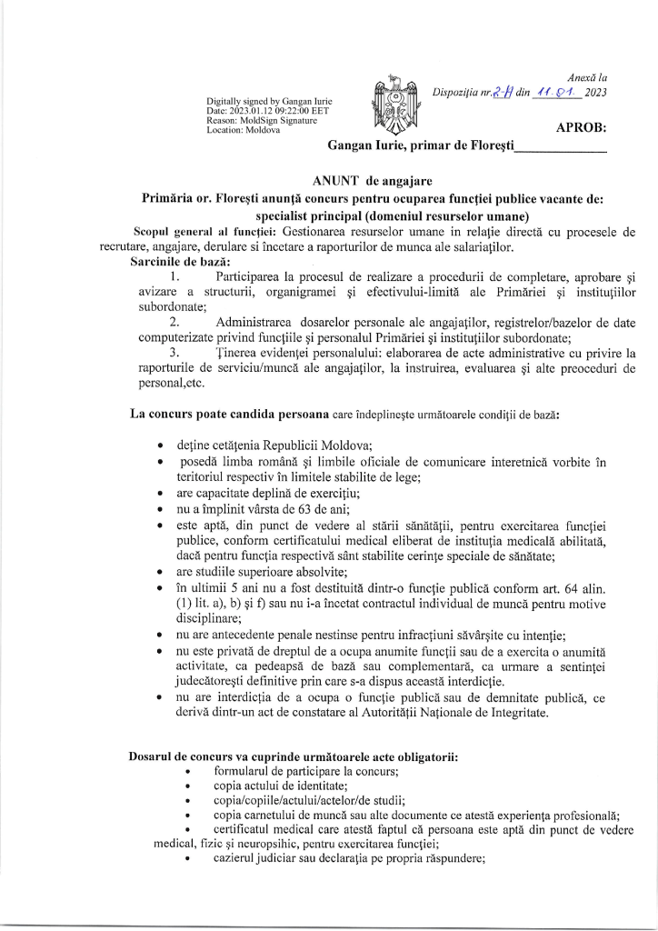 Anunț de angajare pentru funcția vacantă de specialist în resurse umane