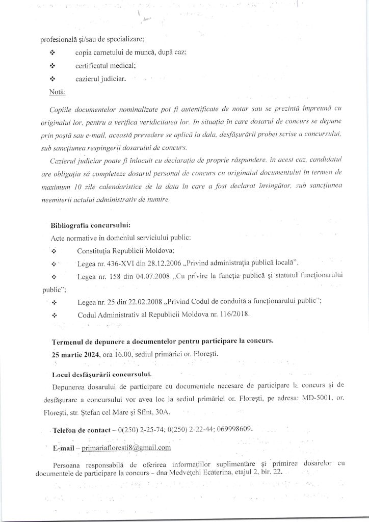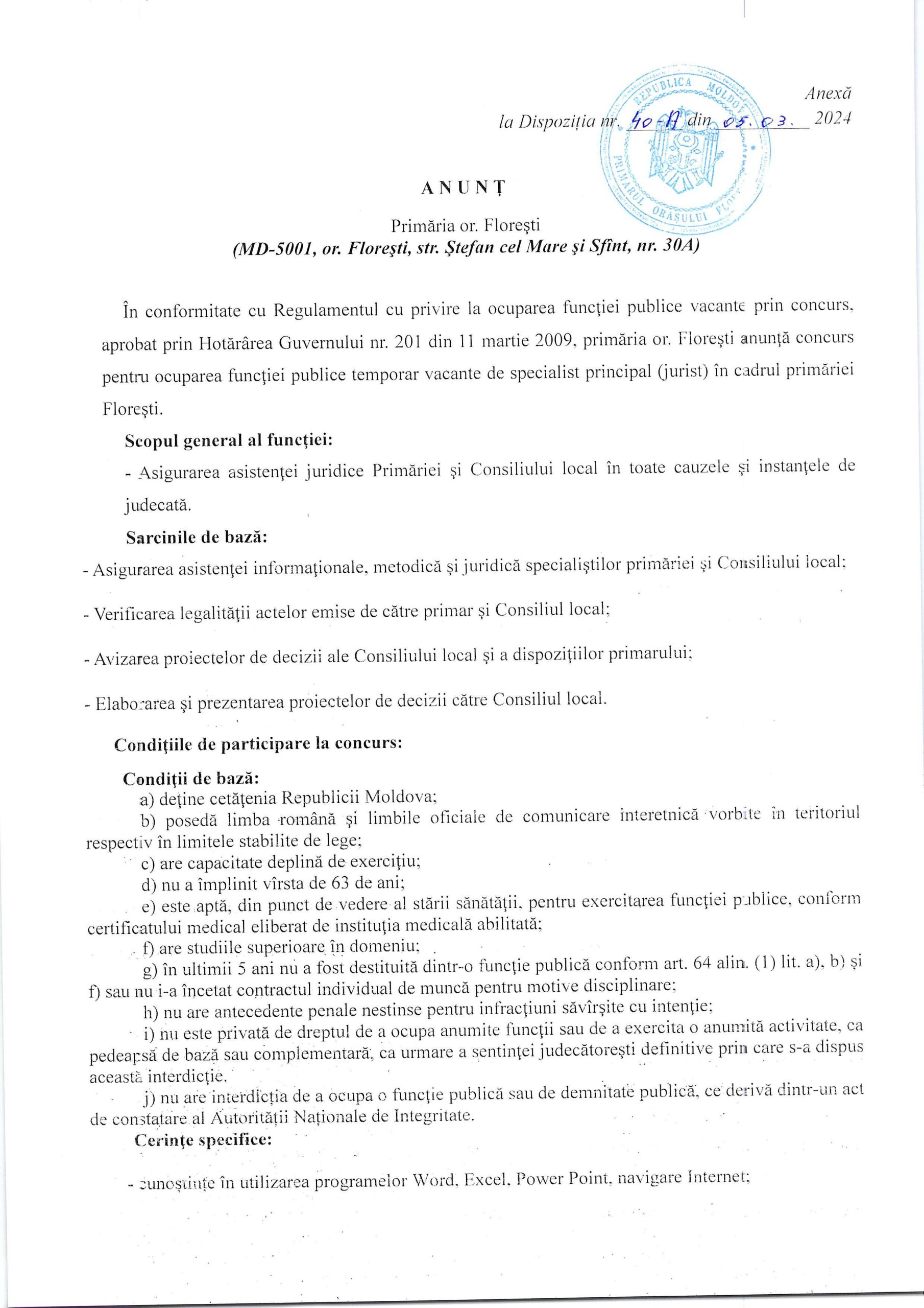 Anunț! Concurs pentru funcția publică temporar vacantă de specialist principal (jurist)