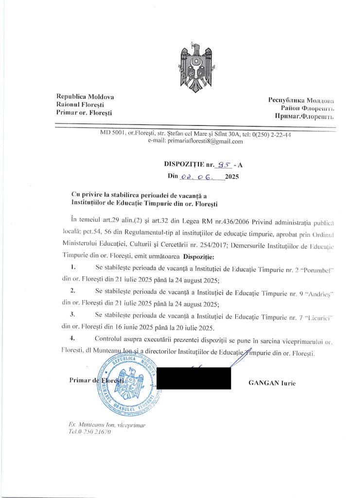 Anunț cu privire la stabilirea perioadei de vacanță în grădinițele din or. Florești