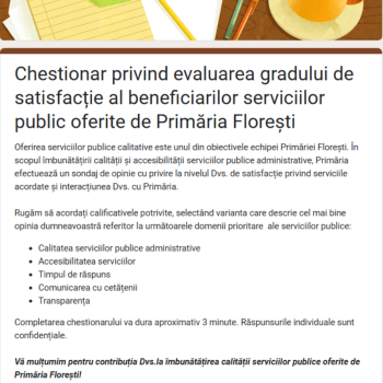 Evaluarea Servicii Publice- Opinia Dumneavoastră contează! Oferirea Serviciilor Publice de calitate este unul dintre obiectivele echipei Primăriei orașului Florești Vă invităm să participați la completarea chestionarului privind evaluarea gradului de satisfacție al persoanelor care au beneficiat de serviciile publice oferite de instituția noastră. • Cum să participați. Accesați https://forms.gle/Ene7zEamLiaX1LA96 sau scanați QR-codul de mai jos și răspundeți […]